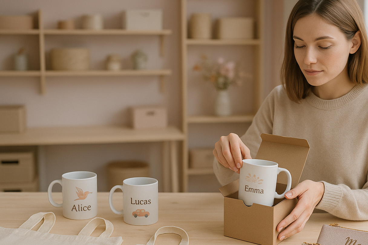 Des créations personnalisées, faites main en France. Mugs, trousses, textiles et accessoires pensés pour le quotidien, à personnaliser selon vos envies. Chaque pièce est préparée avec soin dans notre atelier et expédiée rapidement, avec suivi.
